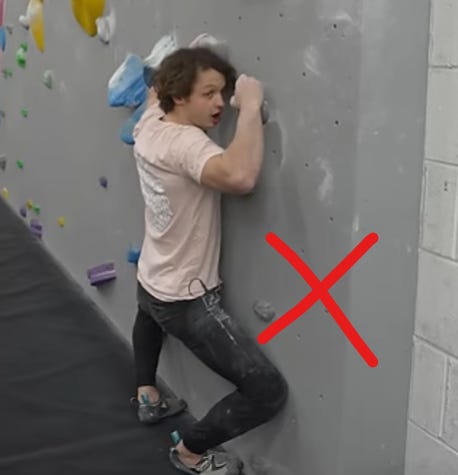 Your default response might simply be to try harder.1 Jump higher. Explode with your legs more. But there’s a fundamental problem with this approach: the wall. It’s, well, a wall. It’s static. The wall isn’t changing to accommodate your bigger jump. The wall won’t move out of your way. The wall occupies the same place in space that you want your body to occupy: the space directly over your foothold. And in a battle for territory between you and the wall, the wall always wins.